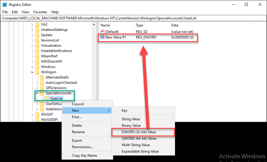 HKEY_LOCAL_MACHINE\SOFTWARE\Microsoft\Windows NT\CurrentVersion\Winlogon\SpecialAccounts\Userlistkey